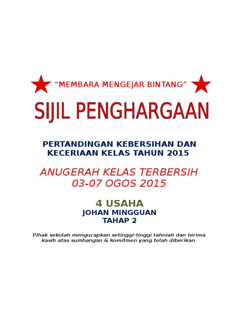 Contoh borang markah pertandingan kebersihan dan keceriaan kelas by mohdalimie. Melalui sijil penghargaan sekolah , barangan atau wang tunai. Template sijil free download template sijil kosong background sijil kosong contoh sijil penyertaan pertandingan template sijil penghargaan e sijil. Kelas paling bersih akan diberikan sijil penghargaan atau hadiah sagu hati. Contoh sijil pertandingan keceriaan kelas. (tempat pertama mingguan = rm20.00 . Contoh pertandingan keceriaan kelas unit 3k sk sementa facebook. Pertandingan kebersihan dan keceriaan kelas. Sekolah kebangsaan sejagong seri medan, batu pahat sekalung penghargaan kepada tahun 3 kerana menjadi johan tahap 1 minggu: Sukacitanya dianugerahkan sijil penghargaan ini kepada kelas 2 harmoni kerana telah memperoleh anugerah kelas terbersih dalam pertandingan keceriaan… Ketua darjah dijemput menerima kad penghargaan dan piala pusingan. *pastikan anda yang nak keluarkan sijil adalah penganjur yang sah. Anugerah sijil penghargaan setiap minggu dengan nilai kemenangan. Percuma 11 template sijil penyertaan penghargaan pemenang untuk sebarang majlis pertandingan.